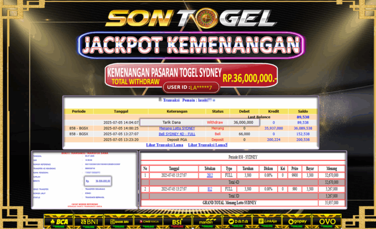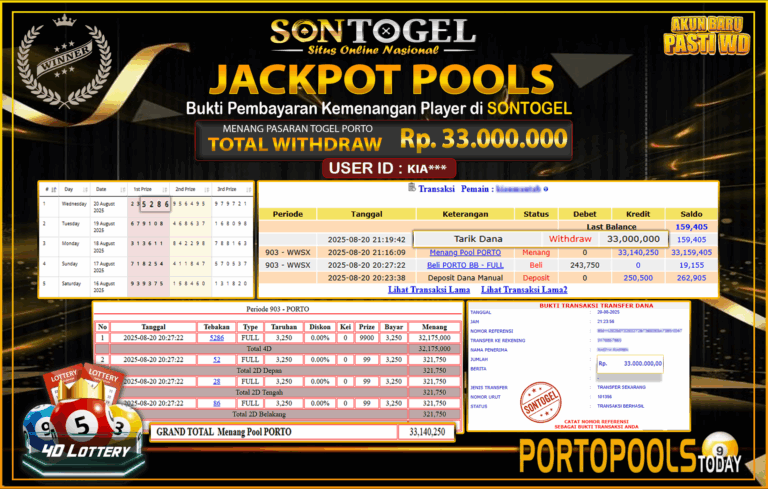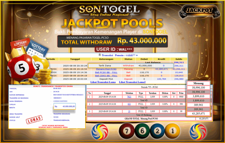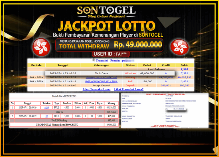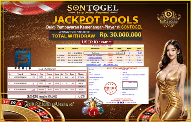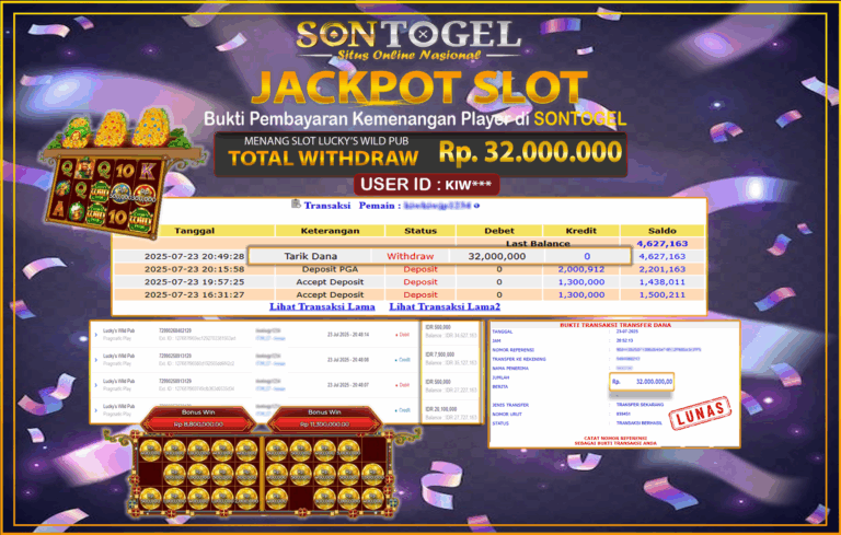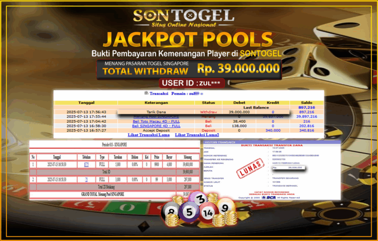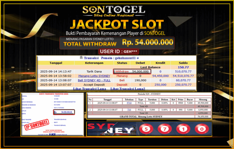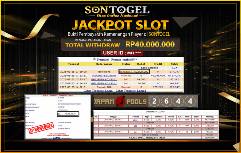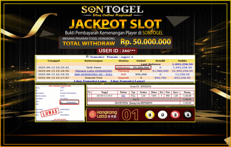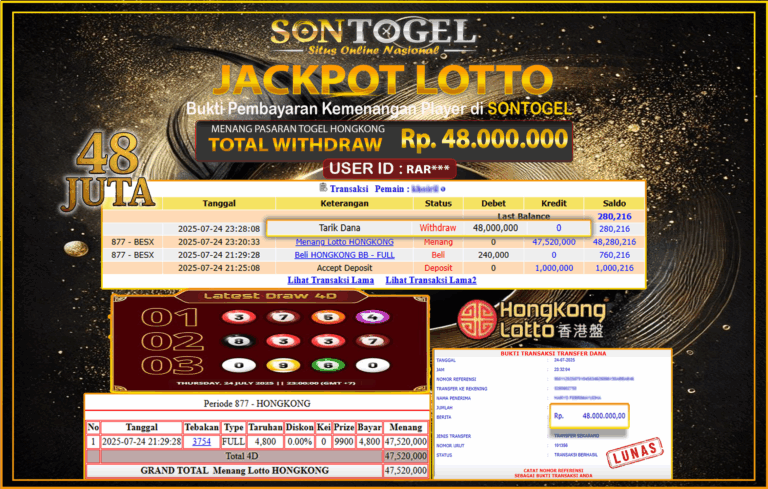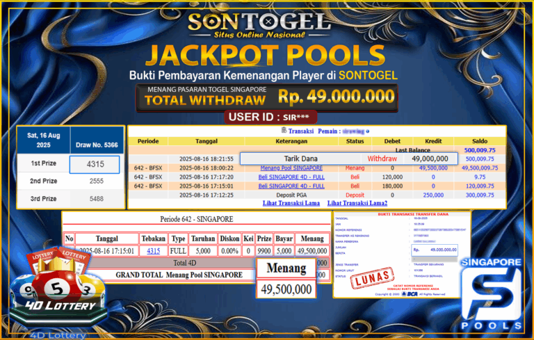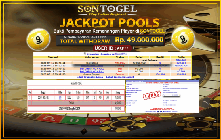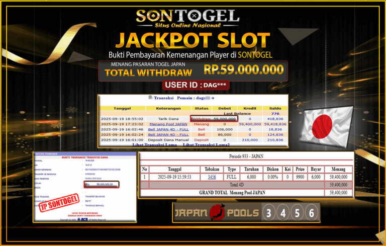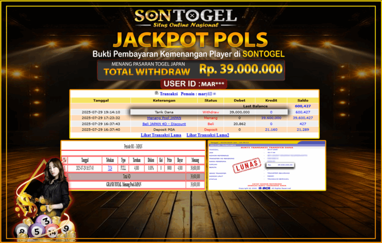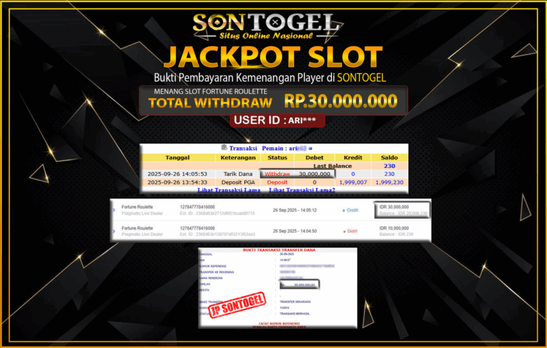 BUKTI JP SONTOGEL – Situs Togel Online, Live Casino dan Slot Online Terpercaya yang terbukti membayar berapapun kemenangan Anda tanpa kekurangan sepeserpun. Jika Anda masih mencari Situs Terpercaya, jangan ragu untuk bermain di SONTOGEL. Dalam 1 akun Anda bisa menikmati semua permainan dengan minimal deposit hanya Rp. 5.000,- saja. Berbagai pasaran togel resmi bisa Anda…
