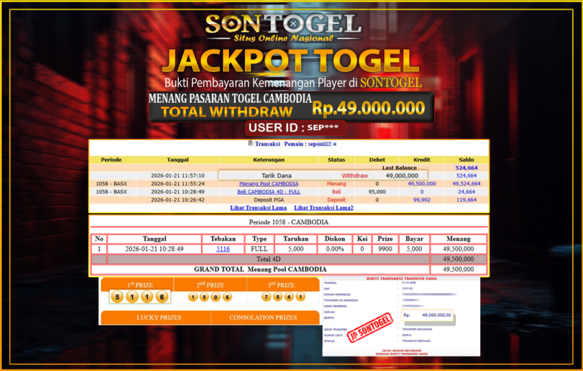 Selamat Kepada Member SONTOGEL dengan USER ID : SEP*** JP PASARAN CAMBODIA Rp.49.000.000,- LUNAS langsung di  transfer ke rekening member tanpa kurang sepeserpun. Terimakasih telah mempercayakan SONTOGEL sebagai Situs Online Terpercaya dan Aman! Jangan tunggu tunggu lagi! langsung saja daftarkan akun bermain di SONTOGEL dan dapatkan bonus berlimpah setiap minggunya.