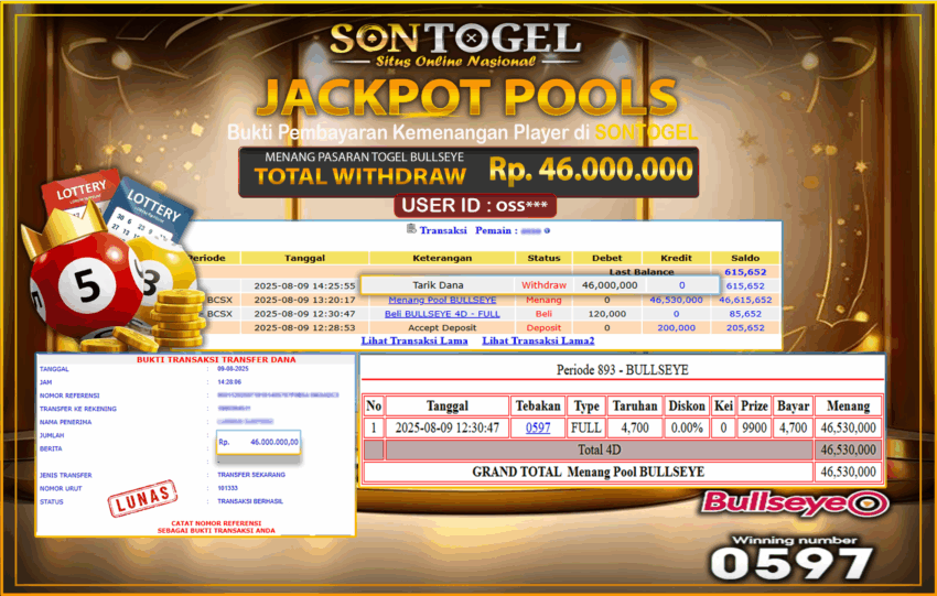 BUKTI JP SONTOGEL – Situs Togel Online, Live Casino dan Slot Online Terpercaya yang terbukti membayar berapapun kemenangan Anda tanpa kekurangan sepeserpun. Jika Anda masih mencari Situs Terpercaya, jangan ragu untuk bermain di SONTOGEL. Dalam 1 akun Anda bisa menikmati semua permainan dengan minimal deposit hanya Rp. 5.000,- saja.
