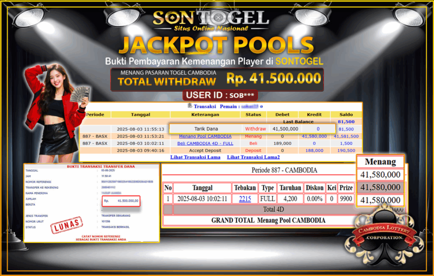 Selamat Kepada Member SONTOGEL dengan USER ID :SOB*** PASARAN TOGEL CAMBODIA sebesar RP.41.500.000,- LUNAS langsung di transfer ke rekening member tanpa kurang sepeserpun. Terimakasih telah mempercayakan SONTOGEL sebagai Situs Online Terpercaya dan Aman! Jangan tunggu tunggu lagi! langsung saja daftarkan akun bermain di SONTOGEL dan dapatkan bonus berlimpah setiap minggunya.