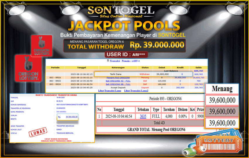 Selamat Kepada Member SONTOGEL dengan USER ID :ARI*** PASARAN TOGEL OREGON 6 sebesar RP.39.000.000,- LUNAS langsung di transfer ke rekening member tanpa kurang sepeserpun. Terimakasih telah mempercayakan SONTOGEL sebagai Situs Online Terpercaya dan Aman! Jangan tunggu tunggu lagi! langsung saja daftarkan akun bermain di SONTOGEL dan dapatkan bonus berlimpah setiap minggunya.
