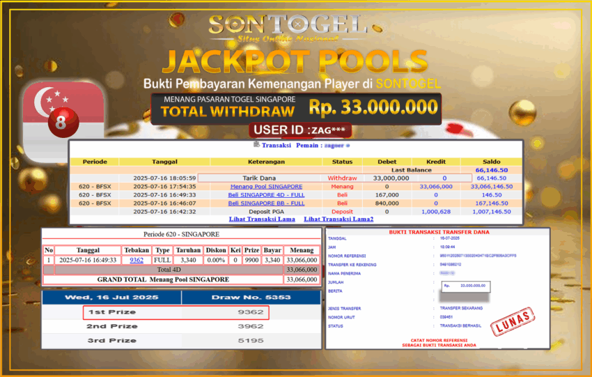 Berikut ini adalah BUKTI JP SONTOGEL yang sudah diproseskan ke rekening member kami