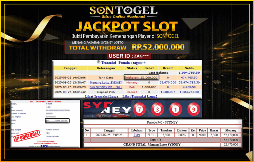 Selamat Kepada Member SONTOGEL dengan USER ID : ZAG*** PASARAN TOGEL SYDNEY sebesar RP.52.000.000,- LUNAS langsung di transfer ke rekening member tanpa kurang sepeserpun. Terimakasih telah mempercayakan SONTOGEL sebagai Situs Online Terpercaya dan Aman! Jangan tunggu tunggu lagi! langsung saja daftarkan akun bermain di SONTOGEL dan dapatkan bonus berlimpah setiap minggunya.
