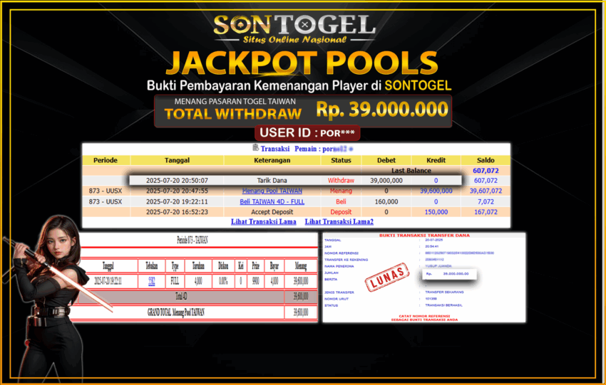 BUKTI JP SONTOGEL – Situs Togel Online, Live Casino dan Slot Online Terpercaya yang terbukti membayar berapapun kemenangan Anda tanpa kekurangan sepeserpun. Jika Anda masih mencari Situs Terpercaya, jangan ragu untuk bermain di SONTOGEL. Dalam 1 akun Anda bisa menikmati semua permainan dengan minimal deposit hanya Rp. 5.000,- saja.