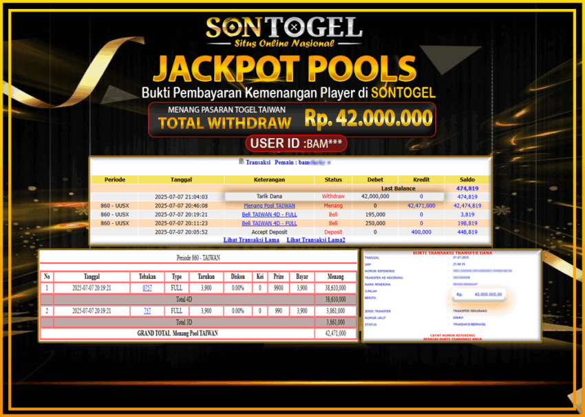 BUKTI JP SONTOGEL – Situs Togel Online, Live Casino dan Slot Online Terpercaya yang terbukti membayar berapapun kemenangan Anda tanpa kekurangan sepeserpun. Jika Anda masih mencari Situs Terpercaya, jangan ragu untuk bermain di SONTOGEL. Dalam 1 akun Anda bisa menikmati semua permainan dengan minimal deposit hanya Rp. 5.000,- saja.
