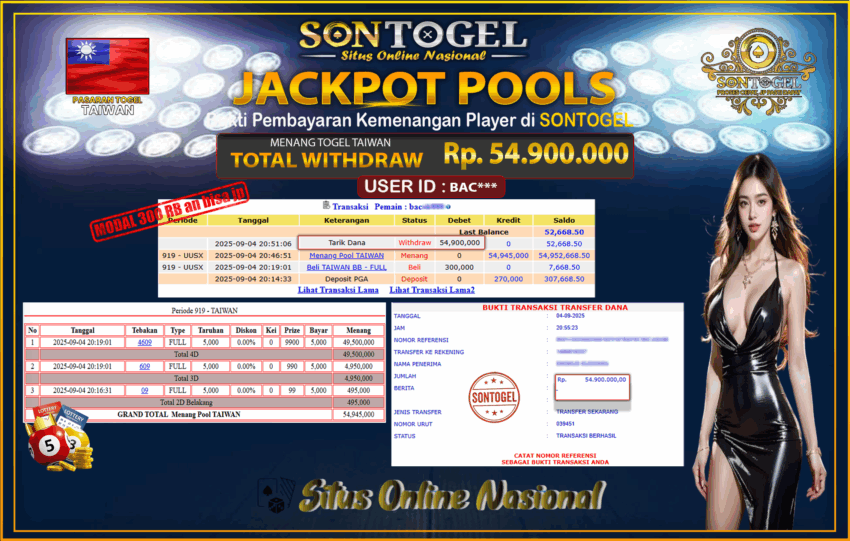 BUKTI JP SONTOGEL – Situs Togel Online, Live Casino dan Slot Online Terpercaya yang terbukti membayar berapapun kemenangan Anda tanpa kekurangan sepeserpun. Jika Anda masih mencari Situs Terpercaya, jangan ragu untuk bermain di SONTOGEL. Dalam 1 akun Anda bisa menikmati semua permainan dengan minimal deposit hanya Rp. 5.000,- saja.