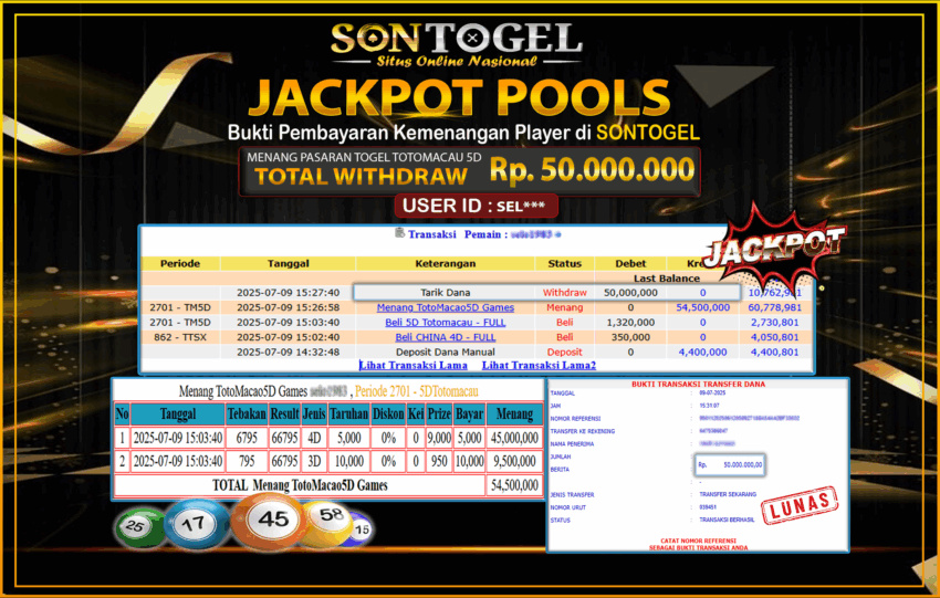 Selamat Kepada Member SONTOGEL dengan USER ID :SEL*** PASARAN TOGEL TOTOMACAU 5D sebesar RP.50.000.000,- LUNAS langsung di transfer ke rekening member tanpa kurang sepeserpun. Terimakasih telah mempercayakan SONTOGEL sebagai Situs Online Terpercaya dan Aman! Jangan tunggu tunggu lagi! langsung saja daftarkan akun bermain di SONTOGEL dan dapatkan bonus berlimpah setiap minggunya.