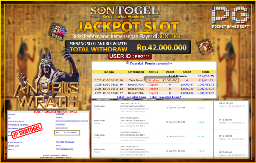 Selamat Kepada Member SONTOGEL dengan USER ID : PRO*** SLOT ANUBIS WRATH di PG SOFT sebesar RP.42.000.000,- LUNAS langsung di transfer ke rekening member tanpa kurang sepeserpun. Terimakasih telah mempercayakan SONTOGEL sebagai Situs Online Terpercaya dan Aman! Jangan tunggu tunggu lagi! langsung saja daftarkan akun bermain di SONTOGEL dan dapatkan bonus berlimpah setiap minggunya.