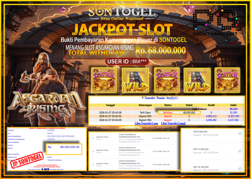 Selamat Kepada Member SONTOGEL dengan USER ID : BRA*** SLOT ASGARDIAN RISING di PG SOFT sebesar RP.68.000.000,- LUNAS langsung di transfer ke rekening member tanpa kurang sepeserpun. Terimakasih telah mempercayakan SONTOGEL sebagai Situs Online Terpercaya dan Aman! Jangan tunggu tunggu lagi! langsung saja daftarkan akun bermain di SONTOGEL dan dapatkan bonus berlimpah setiap minggunya.