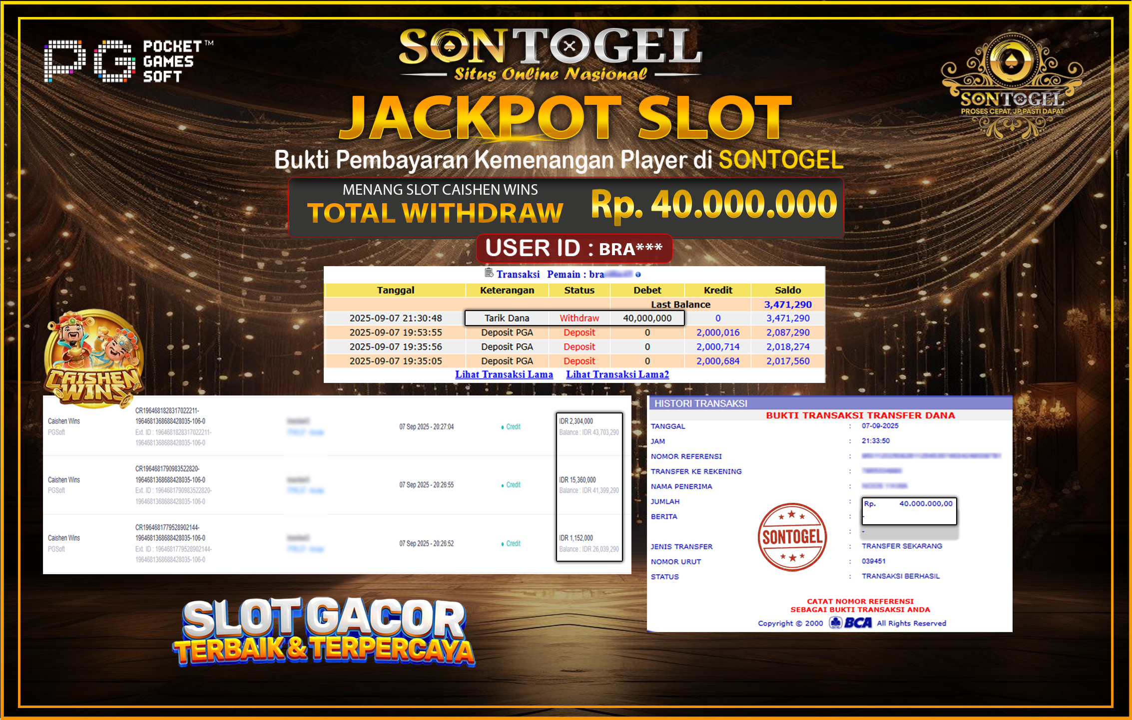 Selamat Kepada Member SONTOGEL dengan USER ID : BRA*** SLOT CAISHEN WINS di PG SOFT sebesar RP.40.000.000,- LUNAS langsung di transfer ke rekening member tanpa kurang sepeserpun. Terimakasih telah mempercayakan SONTOGEL sebagai Situs Online Terpercaya dan Aman! Jangan tunggu tunggu lagi! langsung saja daftarkan akun bermain di SONTOGEL dan dapatkan bonus berlimpah setiap minggunya.