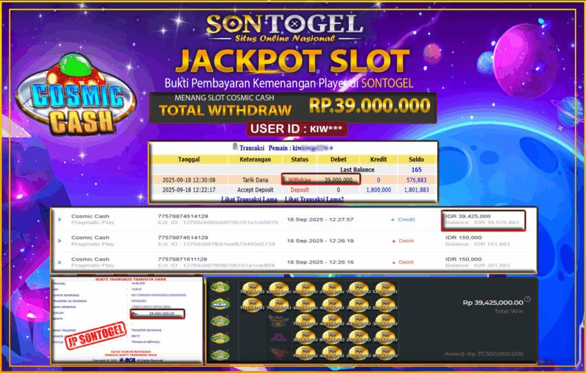 Selamat Kepada Member SONTOGEL dengan USER ID : KIW*** SLOT COSMIC CASH di provider Pragmatic Play sebesar RP.39.000.000,- LUNAS langsung di transfer ke rekening member tanpa kurang sepeserpun. Terimakasih telah mempercayakan SONTOGEL sebagai Situs Online Terpercaya dan Aman! Jangan tunggu tunggu lagi! langsung saja daftarkan akun bermain di SONTOGEL dan dapatkan bonus berlimpah setiap minggunya.