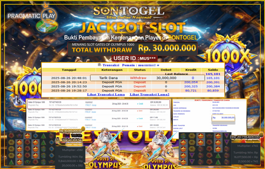 Selamat Kepada Member SONTOGEL dengan USER ID : MUS*** SLOT GATES OF OLYMPUS 1000 di Pragmatic Play sebesar RP.30.000.000,- LUNAS langsung di  transfer ke rekening member tanpa kurang sepeserpun. Terimakasih telah mempercayakan SONTOGEL sebagai Situs Online Terpercaya dan Aman! Jangan tunggu tunggu lagi! langsung saja daftarkan akun bermain di SONTOGEL dan dapatkan bonus berlimpah setiap minggunya.