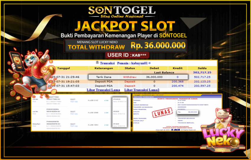 Selamat Kepada Member SONTOGEL dengan USER ID : KAB*** SLOT LUCKY NEKO di provider Pragmatic Play sebesar RP.36.000.000,- LUNAS langsung di transfer ke rekening member tanpa kurang sepeserpun. Terimakasih telah mempercayakan SONTOGEL sebagai Situs Online Terpercaya dan Aman! Jangan tunggu tunggu lagi! langsung saja daftarkan akun bermain di SONTOGEL dan dapatkan bonus berlimpah setiap minggunya.