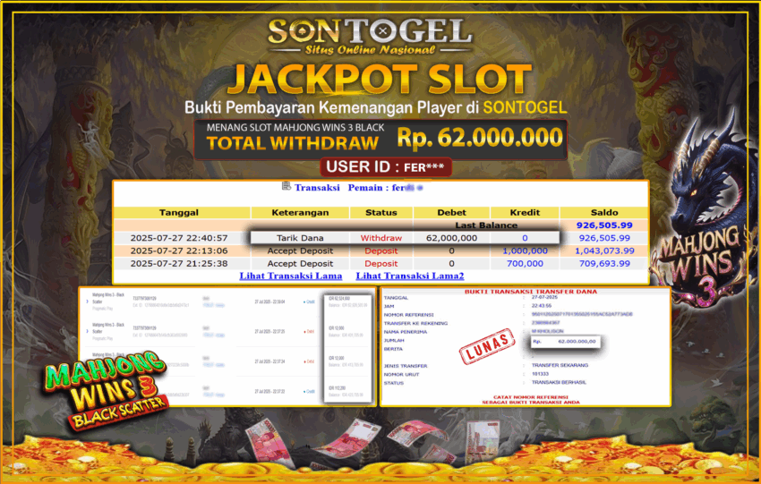 Selamat Kepada Member SONTOGEL dengan USER ID : FER*** SLOT MAHJONG WINS 3 BLACK di provider Pragmatic Play sebesar RP.62.000.000,- LUNAS langsung di transfer ke rekening member tanpa kurang sepeserpun. Terimakasih telah mempercayakan SONTOGEL sebagai Situs Online Terpercaya dan Aman! Jangan tunggu tunggu lagi! langsung saja daftarkan akun bermain di SONTOGEL dan dapatkan bonus berlimpah setiap minggunya.