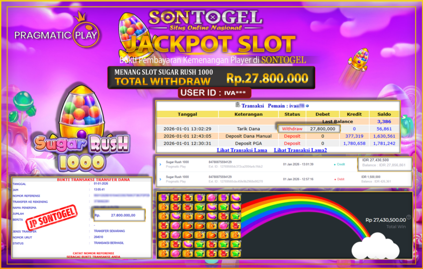 Selamat Kepada Member SONTOGEL dengan USER ID : IVA*** SLOT SUGAR RUSH 1000 di provider Pragmatic Play sebesar RP.27.800.000,- LUNAS langsung di transfer ke rekening member tanpa kurang sepeserpun. Terimakasih telah mempercayakan SONTOGEL sebagai Situs Online Terpercaya dan Aman! Jangan tunggu tunggu lagi! langsung saja daftarkan akun bermain di SONTOGEL dan dapatkan bonus berlimpah setiap minggunya.