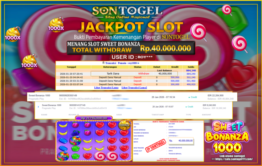 Selamat Kepada Member SONTOGEL dengan USER ID : ROY*** SLOT SWEET BONANZA 1000 di PRAGMATIC PLAY sebesar RP.40.000.000,- LUNAS langsung di  transfer ke rekening member tanpa kurang sepeserpun. Terimakasih telah mempercayakan SONTOGEL sebagai Situs Online Terpercaya dan Aman! Jangan tunggu tunggu lagi! langsung saja daftarkan akun bermain di SONTOGEL dan dapatkan bonus berlimpah setiap minggunya.