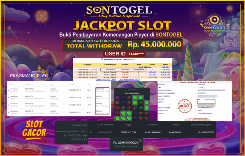 Selamat Kepada Member SONTOGEL dengan USER ID : DAN*** SLOT SWEET BONANZA di PRAGMATIC sebesar RP.45.000.000,- LUNAS langsung di transfer ke rekening member tanpa kurang sepeserpun. Terimakasih telah mempercayakan SONTOGEL sebagai Situs Online Terpercaya dan Aman! Jangan tunggu tunggu lagi! langsung saja daftarkan akun bermain di SONTOGEL dan dapatkan bonus berlimpah setiap minggunya.