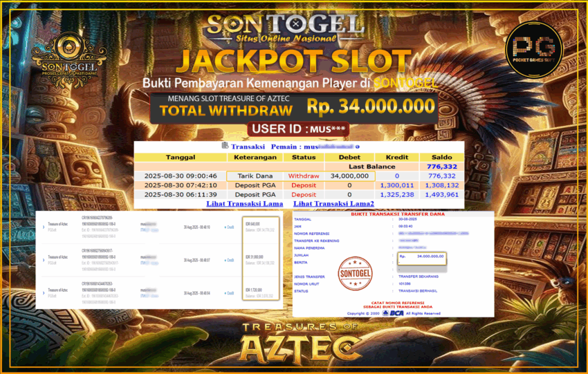 Selamat Kepada Member SONTOGEL dengan USER ID : MUS*** SLOT TREASURES OF AZTEC di PG Soft sebesar RP.34.000.000,- LUNAS langsung di  transfer ke rekening member tanpa kurang sepeserpun. Terimakasih telah mempercayakan SONTOGEL sebagai Situs Online Terpercaya dan Aman! Jangan tunggu tunggu lagi! langsung saja daftarkan akun bermain di SONTOGEL dan dapatkan bonus berlimpah setiap minggunya.