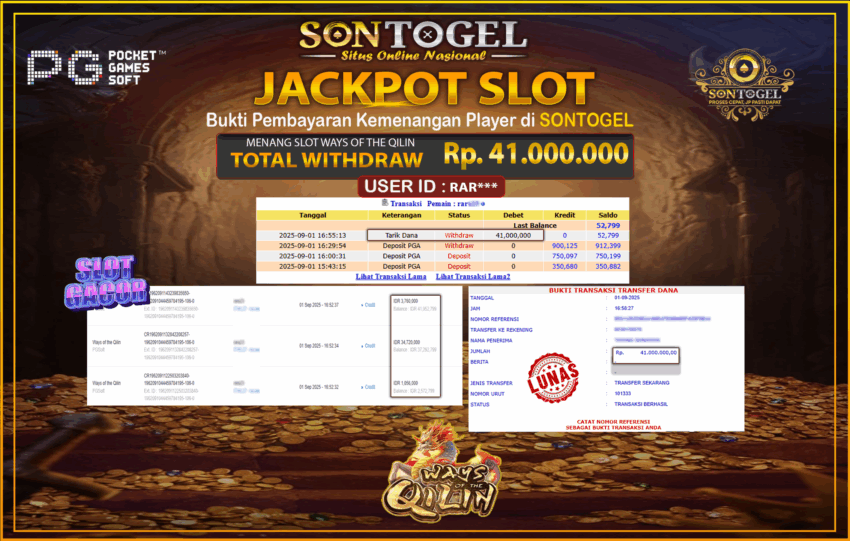 Selamat Kepada Member SONTOGEL dengan USER ID : RAR*** SLOT WAYS OF THE QILIN di PG SOFT sebesar RP.41.000.000,- LUNAS langsung di transfer ke rekening member tanpa kurang sepeserpun. Terimakasih telah mempercayakan SONTOGEL sebagai Situs Online Terpercaya dan Aman! Jangan tunggu tunggu lagi! langsung saja daftarkan akun bermain di SONTOGEL dan dapatkan bonus berlimpah setiap minggunya.