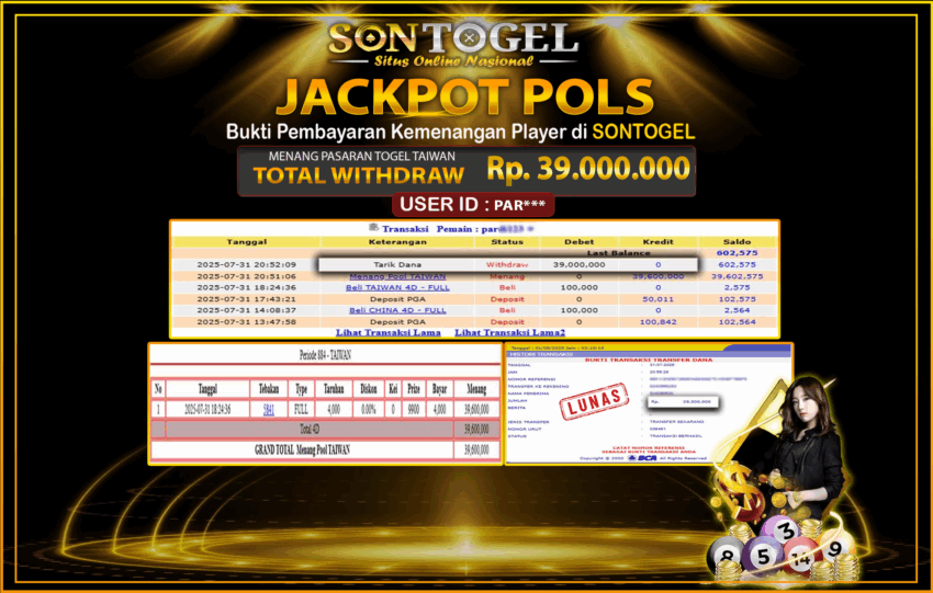 BUKTI JP SONTOGEL – Situs Togel Online, Live Casino dan Slot Online Terpercaya yang terbukti membayar berapapun kemenangan Anda tanpa kekurangan sepeserpun. Jika Anda masih mencari Situs Terpercaya, jangan ragu untuk bermain di SONTOGEL. Dalam 1 akun Anda bisa menikmati semua permainan dengan minimal deposit hanya Rp. 5.000,- saja.